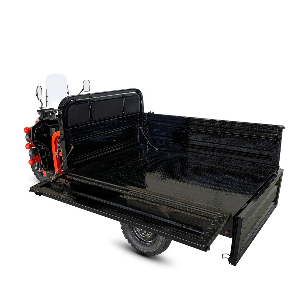 Ребристый усиленный металл, Цельные борта на всю высоту кузова. Откидные задние и боковые борта на быстросъёмных петлях, насечки внутри кузова