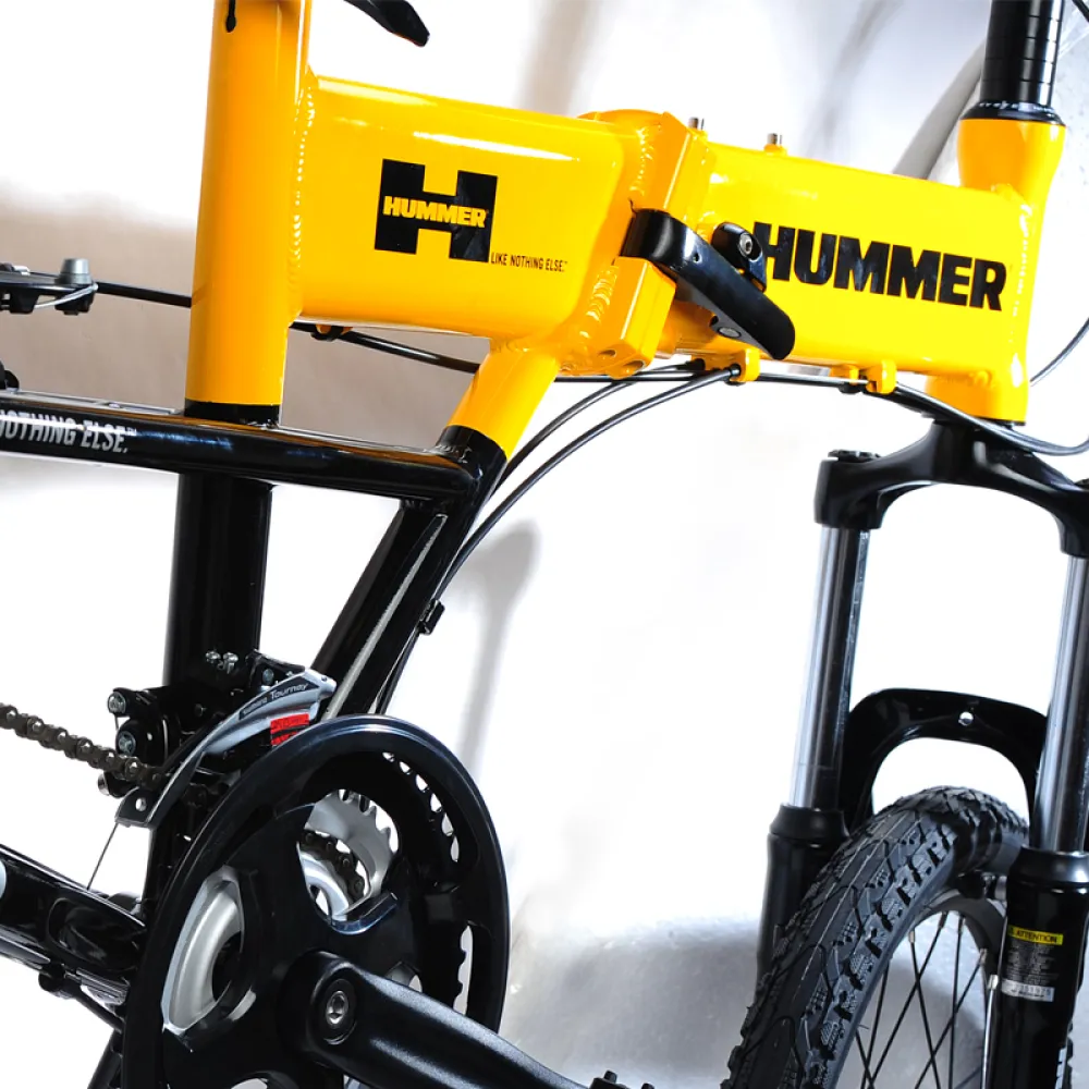 У электровелосипеда HUMMER есть передняя амортизация, повышающая комфортность передвижения. Рама из алюминия складывается, уменьшая габариты вело гибрида вдвое, положить его в багажник автомобиля или убрать на хранение не составит труда.